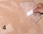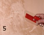 CARAVAGGIO (אפקט ברוקטו): טיח דקורטיבי לאפקט קטיפתי. 1. יש למרוח שתי שכבות של GENYUS SPECIAL לבן, שהוא צבע יסוד חשוב ביותר עבור CARAVAGGIO. יש לדלדל את החומר כהלכה. יש לאפשר לחומר להתייבש למשך 4 עד 5 שעות בין השכבות (תמונה 1). 2. יש למרוח שכבה אחת של Caravaggio באמצעות שפכטל הפלסטיק המקצועי ל-Caravaggio. יש להניח לחומר להתייבש בערך 6 - 8 שעות בין השכבות(תמונה 2) . 3. יש למרוח את שכבת ה-CARAVAGGIO השנייה באזורים קטנים של כמטר רבוע אחד, כל אזור בנפרד, בשכבות מעט עבות יותר מהשכבה הראשונה(תמונה 3). 4. יש להחליק את המשטח מיד, בתנועות מעגליות באמצעות שפכטל הברוקטו האדום (תמונה 5).