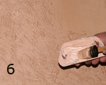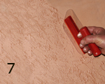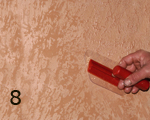 CARAVAGGIO (אפקט דמסקטו): טיח דקורטיבי לאפקט קטיפתי. 1. יש למרוח שתי שכבות של GENYUS SPECIAL לבן, שהוא צבע יסוד חשוב ביותר עבור CARAVAGGIO. יש לדלדל את החומר כהלכה. יש לאפשר לחומר להתייבש למשך 4 עד 5 שעות בין השכבות (תמונה 1). 2. יש למרוח שכבה אחת של Caravaggio באמצעות שפכטל הפלסטיק המקצועי ל- Caravaggio. יש להניח לחומר להתייבש בערך 6 - 8 שעות בין השכבות (תמונה 2). 3. יש למרוח את שכבת ה-Caravaggio השנייה על מנת לשטח את המשטח ככל האפשר. יש לאפשר לחומר להתייבש למשך כ-6 שעות (תמונה 3). 4. יש למרוח מעט Caravaggio על שפכטל הברוקטו האדום באמצעות מברשת צבע רגילה. יש להתחיל בעבודה על המשטח בכיוונים שונים (תמונה 6). 5. יש להמתין חמש דקות בקירוב, ולעבור על המשטח שוב, בנגיעות קלות מאד בכיוונים שונים, כפי שמודגם בסרט הווידאו (תמונה 8) . |